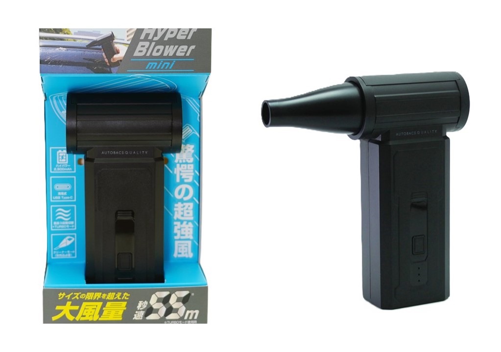 オートバックス「AQ.ハイパーブロアー mini」は洗車後の水滴飛ばしを補助するツールとして優秀です。 ターボモードでは55m(約198km/h)を実現し、洗車後の細部の水滴飛ばしに最適。